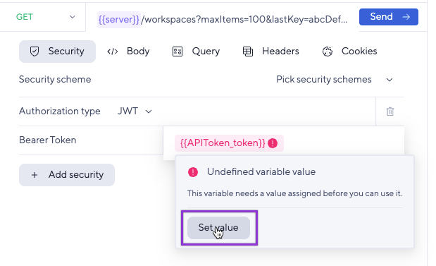 Apply your API access token in the Security tab by selecting the Bearer Token value field and then selecting Set value to start replacing the current value.