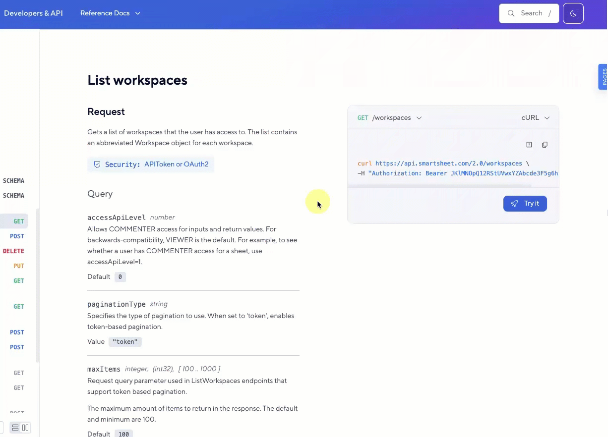 - OpenAPI Reference: skip ahead to learn about resource endpoints and objects, including Sheets, Cells, Folders, and more